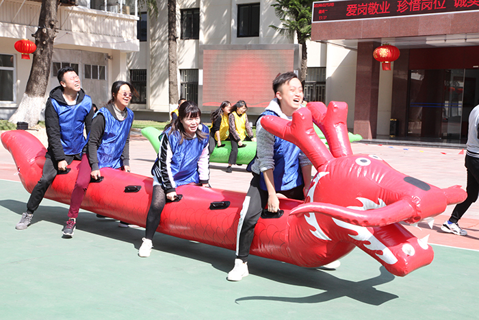 在 “蜈蚣”運球游戲中,穿著(zhù)五彩隊衣的職工們與彩色的瑜伽球交相輝映,如行走的色彩在原本單一的球場(chǎng)上筆筆流動(dòng),偶爾一個(gè)小失誤球掉了,隊員們互相鼓勵著(zhù),把五個(gè)球運送到目的地;在超級障礙賽中,參賽者們時(shí)而“翻山越嶺”、時(shí)而“匍匐前行”,接力棒在隊友間快速地傳遞著(zhù);在“歡樂(lè )龍舟”游戲中中,隊員們快速地穿梭在賽道上,到達終點(diǎn)時(shí)都不約而同地大喘氣,嘴里還不停說(shuō)著(zhù)“太累了”,但是在完成的那一刻都歡呼雀躍起來(lái);在摸石頭過(guò)河中,隊員們充分發(fā)揮自己的智慧與力量,“應該脫了鞋走”“應該手腳配合一步一個(gè)彩磚走”……大家激烈地討論著(zhù),在那些落后的隊伍身旁也總能看到隊友們在加油鼓勁。在多向拔河賽中,各隊伍隨著(zhù)“1,2,1,2”的口號聲用力地拉扯著(zhù)粗繩,緊張的氣氛下,中心線(xiàn)一會(huì )兒看著(zhù)要落向紅色區域,轉瞬卻又落向紫色…… 元宵趣味活動(dòng)在一片歡聲笑語(yǔ)中落下帷幕。