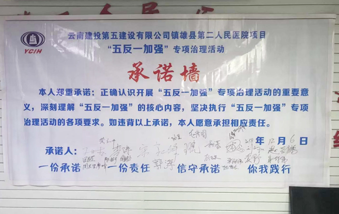 直管部安全總監著(zhù)重安排部署了項目部此次活動(dòng)開(kāi)展的具體方案,所有管理人員和勞務(wù)班組在直管部經(jīng)理的帶領(lǐng)下宣讀了承諾:“正確認識開(kāi)展“五反一加強”專(zhuān)項治理活動(dòng)的重要意義,深刻理解“五反一加強”的核心內容,堅決執行“五反一加強”專(zhuān)項治理活動(dòng)的各項要求?!彼袇?huì )人員鄭重的在承諾墻上簽上了自己的姓名。