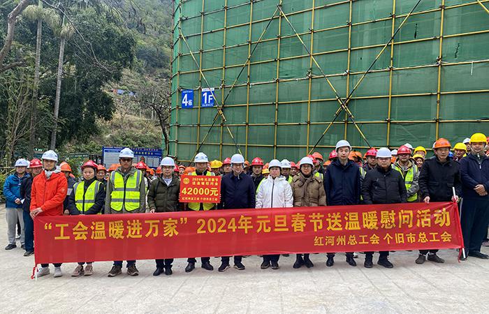 心系職工,情暖一線(xiàn)。1月23日,龍年新春佳節即將來(lái)臨之際,紅河州總工會(huì )黨組書(shū)記、常務(wù)副主席姜云,個(gè)舊市人大常委會(huì )副主任、市總工會(huì )主席許雪梅率慰問(wèn)組到公司第二直管項目部負責施工的個(gè)舊市工人療養院提升改造項目開(kāi)展“工會(huì )溫暖進(jìn)萬(wàn)家”2024年元旦春節送溫暖慰問(wèn)活動(dòng)。