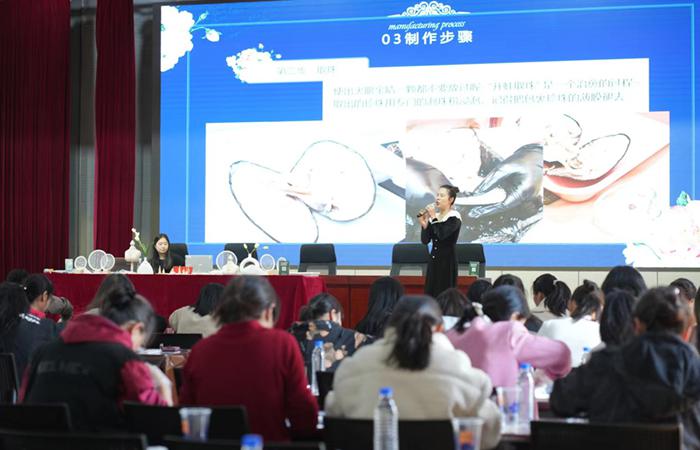 活動(dòng)現場(chǎng),老師為大家發(fā)放珍珠蚌和制作工具,指導大家開(kāi)蚌取珠?!懊ず惺健遍_(kāi)蚌,珍珠的大小、顏色、形狀未知,讓大家多了不少期許和驚喜,感受著(zhù)小小珍珠帶來(lái)的迷人魅力。隨著(zhù)一只只珍珠蚌被打開(kāi),一顆顆晶瑩透亮的珍珠映入眼簾,此起彼伏的贊嘆聲、歡呼聲彰顯著(zhù)大家的激動(dòng)與興奮。經(jīng)過(guò)開(kāi)蚌取珠、清洗拋光、打孔制作等工序,挑選自己喜歡的首飾款式,遞工具、傳材料、搭把手……普通的小珍珠變成了一件件獨具匠心、光彩奪目的精美飾品,讓大家鑄就了專(zhuān)屬自己的獨一無(wú)二的溫潤與優(yōu)雅。