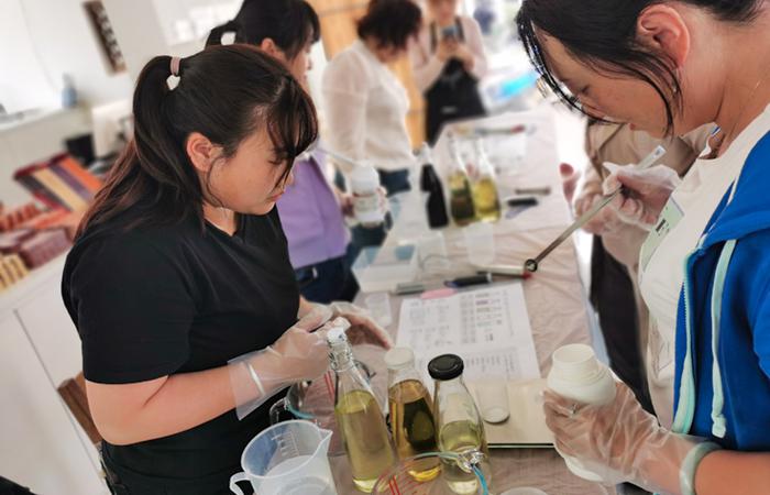 在專(zhuān)業(yè)芳香師的指導下,參加活動(dòng)的職工兩人一組、通力配合,在掌握精確的溫度和重量后,大家在量杯中有序地加入各種原料和自己喜歡的精油,通過(guò)持續攪拌,神奇的化學(xué)反應給大家帶來(lái)了驚喜,皂液倒入模具后呈現的各種形狀也讓人賞心悅目。