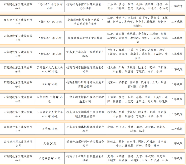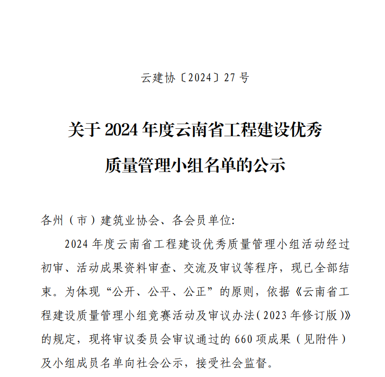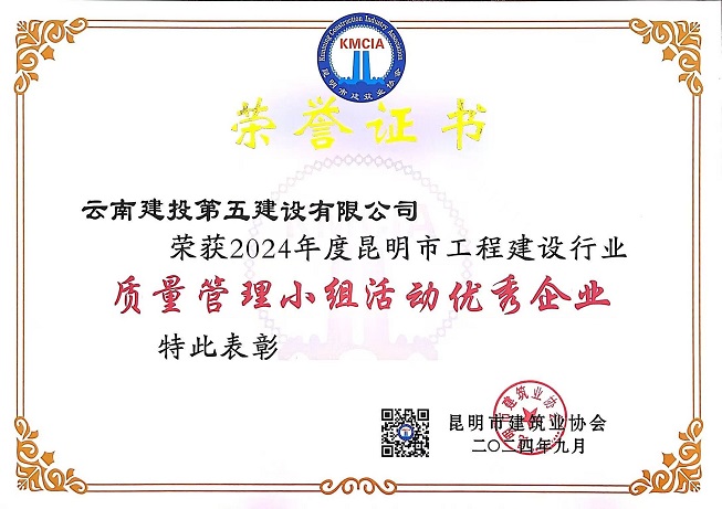 近日,昆明市建筑業(yè)協(xié)會(huì )、云南省建筑業(yè)協(xié)會(huì )及中國建筑業(yè)協(xié)會(huì )相繼頒發(fā)了2024年度工程建設質(zhì)量管理小組活動(dòng)成果,公司憑借精細化的過(guò)程質(zhì)量管理和精益求精的品質(zhì)管理,榮獲2024年度中國建筑業(yè)協(xié)會(huì )工程建設質(zhì)量管理小組成果二等獎1項、云南省工程建設優(yōu)秀質(zhì)量管理小組成果11項、昆明市工程建設優(yōu)秀質(zhì)量管理小組成果4項,獲評昆明市建筑業(yè)協(xié)會(huì )“質(zhì)量管理優(yōu)秀企業(yè)”榮譽(yù)稱(chēng)號。