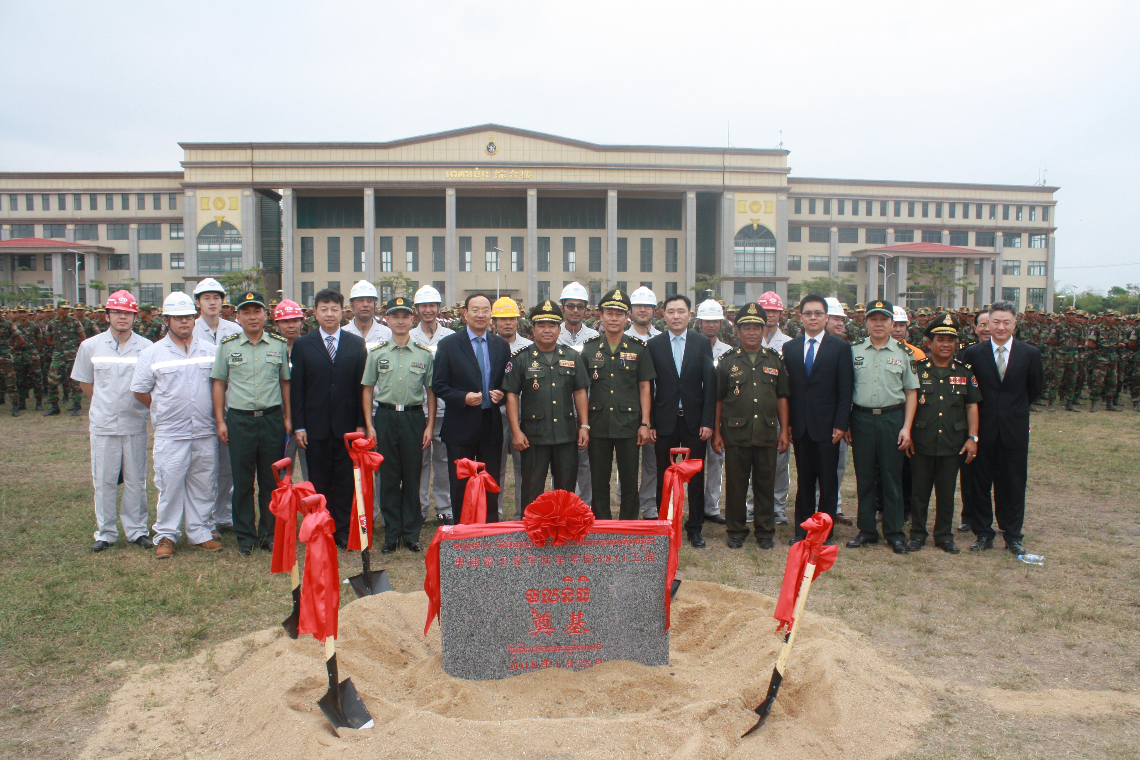 柬埔寨王家軍陸軍學(xué)院院長(cháng)莫云、集團國際工程部副總經(jīng)理陳榮剛、集團中層副職李紹泉、柬埔寨區域經(jīng)理孫弢、國際部柬埔寨生產(chǎn)副總柴少康、公司第六直管部經(jīng)理應軍、第一安裝直管部主任工程師夏淵等出席奠基儀式。