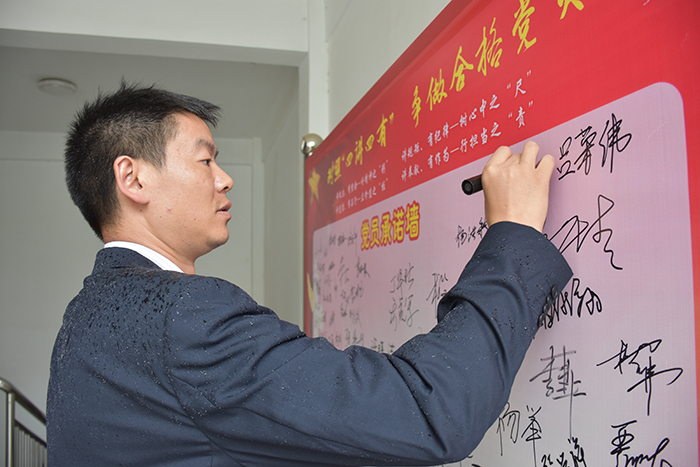 參會(huì )的150余名黨員在承諾墻上簽字承諾:對照“四講四有”,爭做合格黨員。