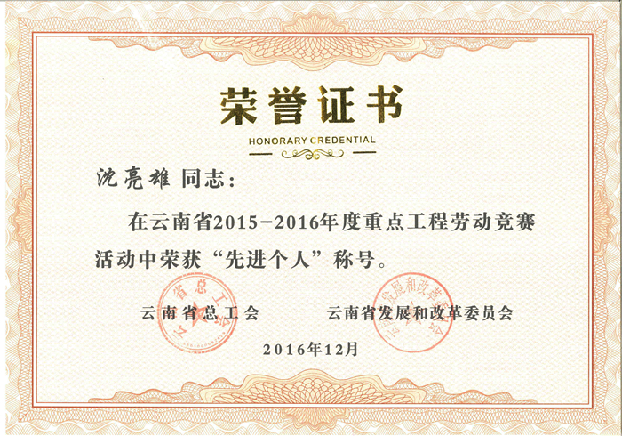 沈亮雄獲云南省重點(diǎn)工程勞動(dòng)競賽“先進(jìn)個(gè)人”稱(chēng)號