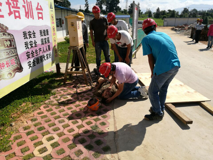 演練模擬了施工現場(chǎng)工人觸電救援的過(guò)程。一名工人在接電時(shí)不小心被電傷,在第一時(shí)間發(fā)現被電傷工人后,到場(chǎng)的人員立即將傷者迅速脫離電源并拉閘斷電,隨即撥打電話(huà)通知應急救援小組成員進(jìn)行搶救。
