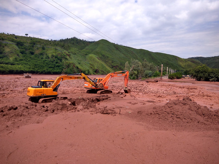 面對最厚達11米多,平均6米左右的土石方堵塞物,9月20日早晨7點(diǎn)由集團總承包一部牽頭,公司五〇一直管項目部、路橋二部組建的搶險小分隊,立即結合任務(wù)區地理條件特點(diǎn),積極會(huì )同元謀縣“9·17”特大山洪泥石流災害搶險救災指揮部現場(chǎng)制定搶險方案。果斷采取“礫石換填成基,挖洗沖淤成槽,泄流降水排險,多頭并進(jìn)作業(yè)”的實(shí)施辦法,共組織30人,投入挖機7臺、裝載機2臺進(jìn)行堰塞湖下游疏浚施工,并利用1臺無(wú)人機實(shí)時(shí)監測現場(chǎng)情況。