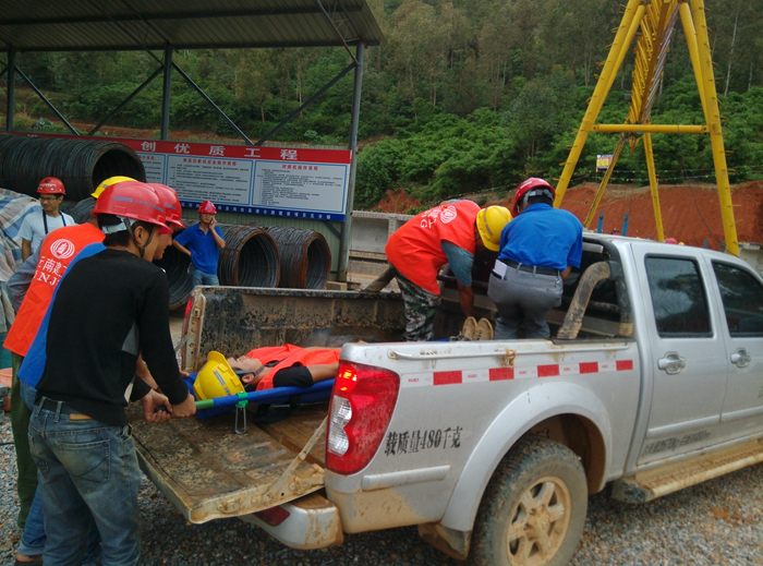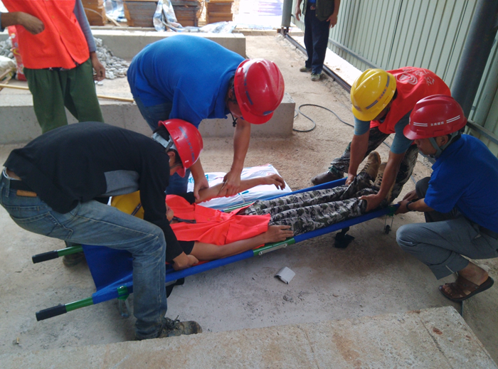 項目部模擬了電工在預制場(chǎng)內梳理電線(xiàn)時(shí),由于電源線(xiàn)絕緣層破損漏電造成觸電的事故現場(chǎng)。演練中,現場(chǎng)作業(yè)人員在發(fā)現事故后,立即向現場(chǎng)負責人報告,接到報告后現場(chǎng)負責人馬上匯報項目負責人,項目負責人立即啟動(dòng)觸電事故應急救援程序,組織人員對觸電者進(jìn)行急救,并向當地醫院請求救援,由于觸電者“傷勢嚴重”,醫院救護車(chē)輛仍未到達,應急救援指揮長(cháng)馬上組織人員將傷者移至應急救援車(chē)輛上并出發(fā),在應急救護小組成員的陪同下與醫院救護車(chē)接頭。