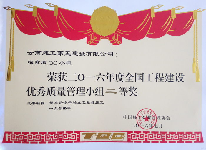 2016年7月7日,公司第四直管項目部申報的“提高屈曲約束支撐節點(diǎn)板安裝一次合格率”成果獲中國施工企業(yè)管理協(xié)會(huì )2016年度全國工程建設優(yōu)秀質(zhì)量管理小組一等獎;“提高后澆帶獨立柱支撐施工一次合格率”成果獲中國施工企業(yè)管理協(xié)會(huì )2016年度全國工程建設優(yōu)秀質(zhì)量管理小組二等獎。此前,該小組的以上兩項成果均獲得2016年度云南省工程建設優(yōu)秀質(zhì)量管理小組一等獎。