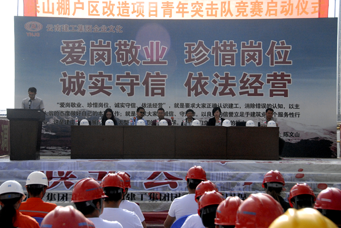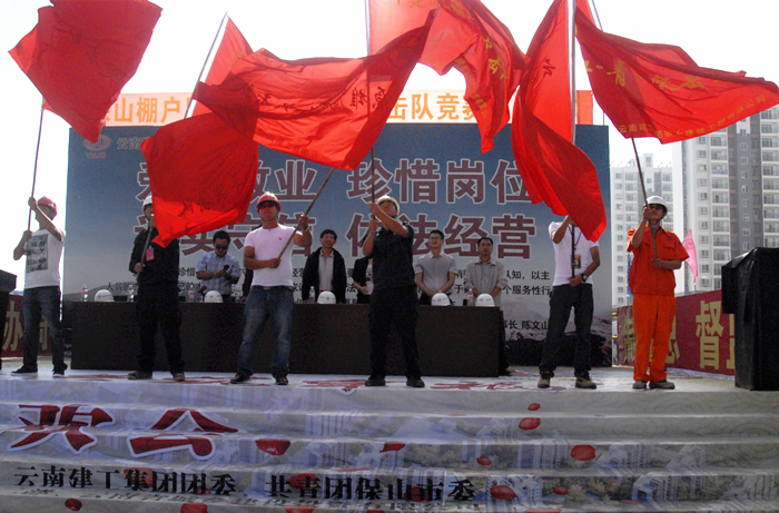 技術(shù)支持: 方森科技 9月15日上午,保山棚改項目舉行青年突擊隊授旗儀式,團省委副書(shū)記趙國良宣布保山市青華湖片區紅花二期建設項目青年突擊隊競賽正式啟動(dòng)。共青團保山市委副書(shū)記楊博,集團直屬總承包二部黨總支書(shū)記兼副總經(jīng)理周炳軍,集團團委副書(shū)記楊瑜出席啟動(dòng)儀式。