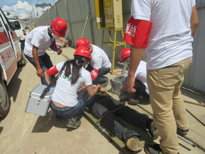 在模擬演練過(guò)程中:現場(chǎng)管理人員發(fā)現施工現場(chǎng)2個(gè)地點(diǎn)出現“火災事故”后,立即向現場(chǎng)安全總監報告,安全總監第一時(shí)間向直管部經(jīng)理吳志鑫匯報,針對發(fā)生火勢情況立即宣布啟動(dòng)項目部消防應急救援預案,項目負責人楊欽隨即帶領(lǐng)各消防應急小組趕赴現場(chǎng)參與救援,并撥打110、120、119請求支援。接到“報警”后,澄江縣公安消防大隊、澄江縣急救站、澄江縣龍街派出所人員第一時(shí)間趕到現場(chǎng),消防官兵及時(shí)用高壓水槍撲滅負一層樓板頂面火勢后,沖到樓板頂面救援,疏散被困人員,現場(chǎng)搜救受傷人員,并及時(shí)撤離現場(chǎng),用擔架把“受傷”人員抬下送至救護車(chē)。到場(chǎng)的急救中心人員做好救援準備,對“傷員”做了簡(jiǎn)單的應急處理,立刻“轉送”醫院救治;派出所民警則有條不紊地在現場(chǎng)維持秩序,配合消防官兵救援。與此同時(shí),項目部消防應急小組搶險組也用干粉滅火器對負二層樓梯口“起火點(diǎn)”進(jìn)行滅火。緊接著(zhù),疏散引導組沖進(jìn)負二層內部解救被困人員,同時(shí)安全警戒組在火災現場(chǎng)拉起警戒線(xiàn),避免現場(chǎng)混亂,醫療救護組緊隨其后進(jìn)入樓層內部,用擔架抬出重傷傷員,到達項目部醫療救護室后,包扎處理檢查傷情等待“急救”。