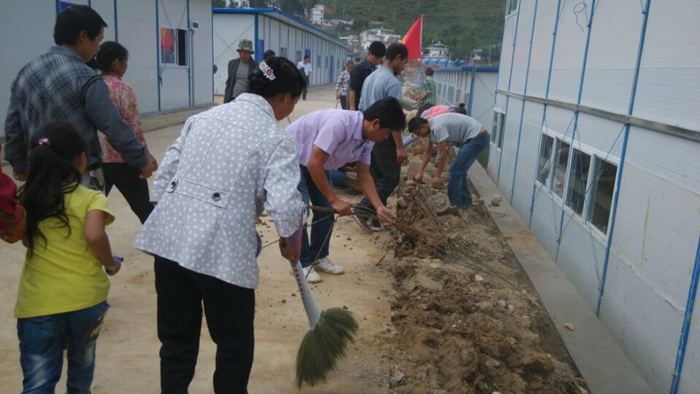 8月29日晚,接到云南建工抗震救災指揮部通知,為確保9月1日龍泉中學(xué)順利開(kāi)學(xué),實(shí)現升國旗、上第一堂課、吃第一餐飯的要求。第九直管項目部2012年昭通保障房項目部迅速組織的30名突擊隊員自備干糧,帶上塑料袋、掃帚、抹布、拖把以及兩輛垃圾清運車(chē)等清理物資,于2014年8月30日上午8時(shí)準時(shí)到達龍泉中學(xué)報到。