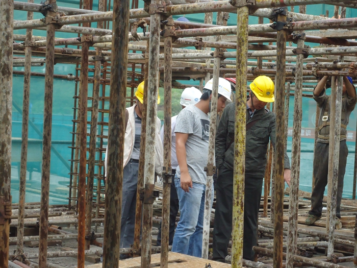 焦倫杰一行首先對生化膜池進(jìn)行實(shí)地觀(guān)查,詳細了解膜池及設備區高支模的相關(guān)技術(shù)和操作細節后,指出施工現場(chǎng)存在的安全問(wèn)題,并要求項目部及時(shí)進(jìn)行整改,針對雨季施工面臨的問(wèn)題給出了解決的意見(jiàn)和建議。