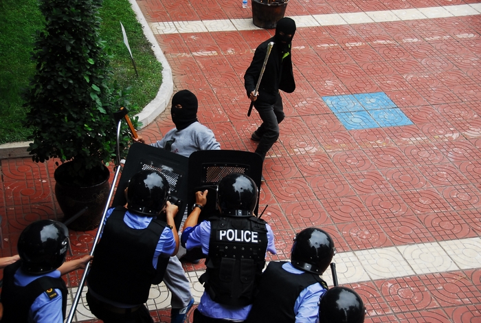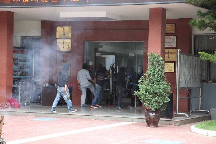 暴恐分子猛擊辦公樓大門(mén)及窗戶(hù),并開(kāi)始縱火、打砸物品。2分鐘后,黑林鋪派出所的特勤人員趕到案發(fā)現場(chǎng),迅速組織兩隊人馬從兩側面包抄,公司保衛部從正面出擊,在三隊人員的密切配合下,最終擊斃兩名暴恐分子,一名被擊中腿部,另一名則棄武器投降。