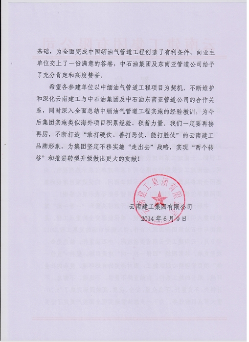 集團致中緬原油管道工程馬德島項目參建單位的賀信