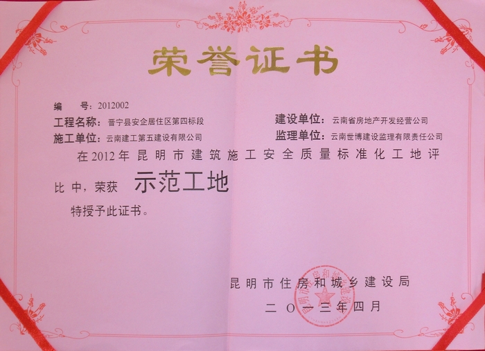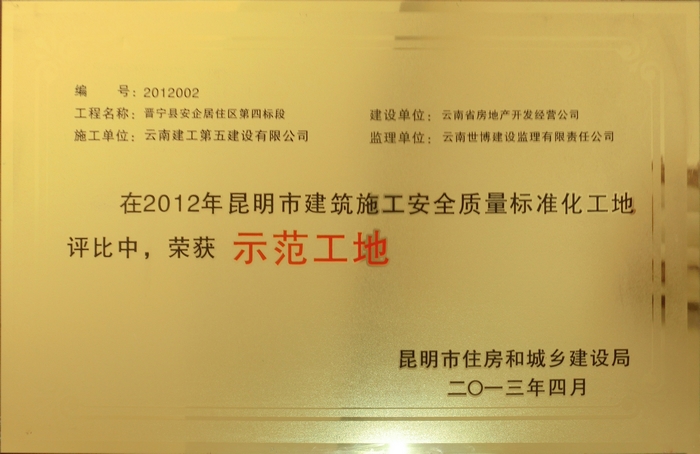技術(shù)支持: 方森科技 近日,公司五〇三直管項目部承建的晉寧縣安企居住區第四標段工程被云南建工集團有限公司授予二〇一二年度“安全質(zhì)量標準化十佳工地”榮譽(yù)證書(shū),另外,該工程在2012年昆明市建筑施工安全質(zhì)量標準化工地評比中,還被昆明市住房和城鄉建設局授予“示范工地”獎牌和榮譽(yù)證書(shū)。