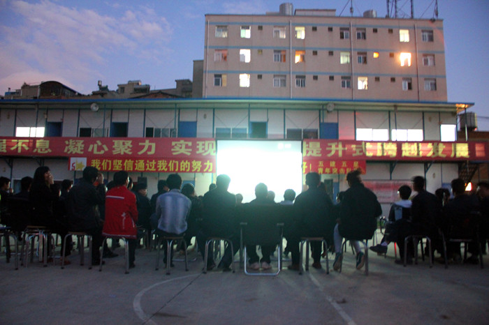 座談會(huì )后,全體人員、農民工兄弟和附近的居民在項目部停車(chē)場(chǎng)一起觀(guān)看了一部露天電影。