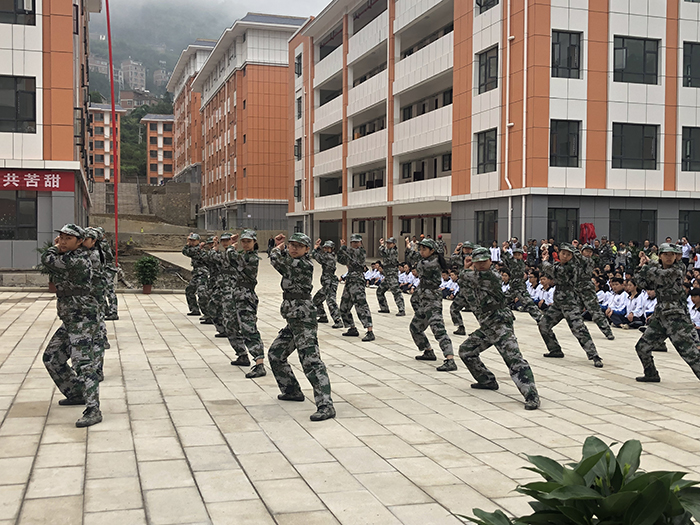 同學(xué)們在平整潔凈的青石地板上進(jìn)行軍訓匯報演出
