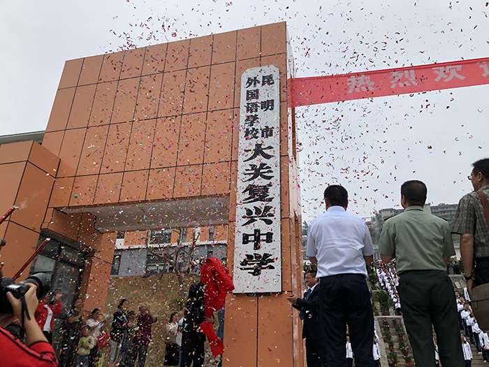 昆明市外國語(yǔ)學(xué)校(大關(guān)復興中學(xué))揭牌儀式在莊嚴肅穆大門(mén)隆重舉行,干凈平坦的道路、寬敞明亮的教學(xué)樓、整潔有序的宿舍樓、溫馨的教師周轉房以及飯菜飄香的食堂一一呈現在大關(guān)全體人民的眼中。