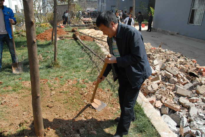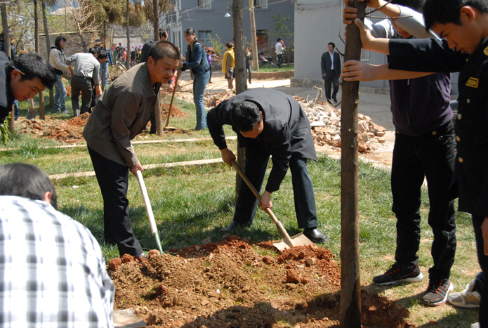 圖為公司副總經(jīng)理王磊邦、李興奎在為樹(shù)苗培土。