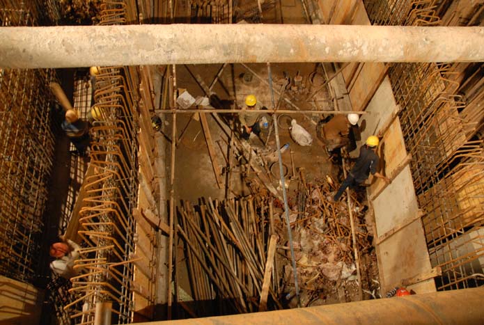 有一段距離施工便道非常近,那天下大雨,劉堅剛從監理公司辦完事回來(lái),開(kāi)挖機的跟他說(shuō)挖不到土了。起初,他以為是對方找借口不想挖土,結果一細看,發(fā)現原來(lái)挖機的位置比路面下沉了近70cm,挖機確實(shí)無(wú)法下去挖土,即便強行開(kāi)下去挖也非常危險,因為鋼板樁已經(jīng)整體下沉。他清楚的記得去監理公司時(shí)沒(méi)發(fā)現有任何異狀,到回來(lái)發(fā)現險情,不超過(guò)3個(gè)小時(shí)?!爱敃r(shí),再不采取措施,就可能面臨重新回填、重新打鋼板樁、重新加固、重新挖土?!眲哉f(shuō),不但經(jīng)濟上要損失,工期也要耽誤。于是,他立即安排人用工字鋼打斜撐,經(jīng)過(guò)3個(gè)多小時(shí)的吊、壓、打、焊,終于止住了土體和鋼板樁下沉?!艾F在看來(lái),那天沒(méi)有白費力氣,如果當時(shí)不及時(shí)采取措施,今天你們看見(jiàn)的就不是現在的樣子(他們正在準備綁扎側壁鋼筋),而可能看到的是正在挖土的情景?!彼挠杏嗉碌恼f(shuō)。