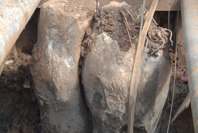在五建公司700m的干渠施工中,有230多米被前期施工單位打了混凝土支護樁,支護樁設計直徑為800mm,但實(shí)際直徑卻擴大到最大的有3.2m,大部分都在2.5至2.6m之間。