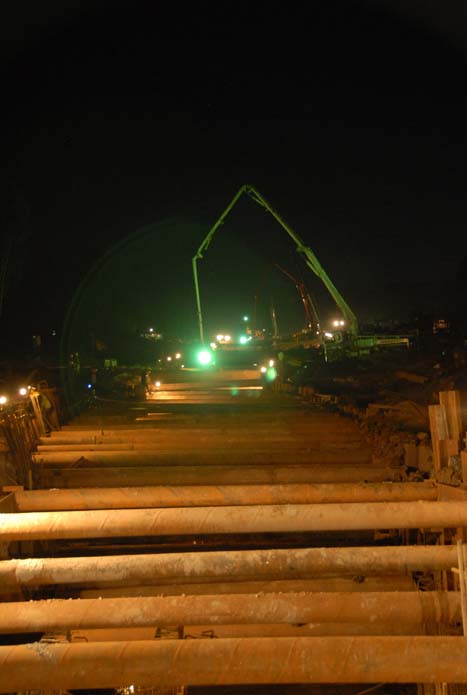 五建公司承擔的滇池環(huán)湖南岸K5+980至K6+680干渠截污工程,全長(cháng)700米,處于k6位置,運輸道路從牛戀(k17)下來(lái),有11公里的坑洼土路,沿途家家都在施工,都在運材料,運輸條件很差。5月24日下了一場(chǎng)雨后,晉城開(kāi)始進(jìn)入雨季。一旦下雨,土場(chǎng)變成爛泥塘,車(chē)子進(jìn)不去,土就拉不出去,材料也拉不進(jìn)來(lái),尤其是混凝土?!坝幸粋€(gè)晚上”,市政直管部經(jīng)理馬慶亮顯得有些無(wú)奈的說(shuō)道,“那天晚上約1點(diǎn)半,很困了,跑回去洗腳睡覺(jué),睡了一會(huì )兒,心里不放心,原因是有一段剛清完底后開(kāi)始下大雨,大約3點(diǎn)多,又爬起來(lái),冒雨跑到混凝土公司,想辦法要了6車(chē)混凝土。按理說(shuō)混凝土車(chē)走的已經(jīng)很慢,從昆陽(yáng)出來(lái),15公里走了近4個(gè)小時(shí),但是來(lái)到半路上(前面11公里路段)還是翻了一車(chē),一車(chē)來(lái)到這里凝固了,只放了4車(chē)混凝土?!薄皬哪且院?,只要下雨,混凝土車(chē)都不想進(jìn)來(lái),累計有5天時(shí)間混凝土拉不進(jìn)來(lái)?!睆乃脑?huà)語(yǔ)中,我感覺(jué)出了一種欲哭無(wú)淚。