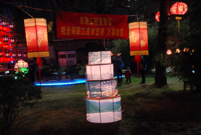 由基層各單位送來(lái)的參展作品異彩紛呈。最醒目的是主席臺旁的公司五大標志性建筑燈箱,新機場(chǎng)項目的詩(shī)詞是機場(chǎng)項目部工會(huì )主席楊應同志所寫(xiě)的《念奴嬌.新機場(chǎng)建設有感》,表現了奮斗在工地上職工們的朝氣蓬勃;506分公司作品是他們自行設計的圖案,開(kāi)頭是4,后面9個(gè)0,象征著(zhù)公司今年要完成40個(gè)億的經(jīng)營(yíng)任務(wù);門(mén)上的兩個(gè)工藝精美的古典燈籠結合我們501分公司的一幢幢現代建筑,古樸中透著(zhù)現代的氣息;第一個(gè)獲得魯班金像獎的505直管項目部的送來(lái)的作品立體又質(zhì)感;海天一色中揚帆的船寓意著(zhù)家福人和,菊香明月,五建一帆風(fēng)順……各式各樣的彩燈都表達著(zhù)對五建公司的美好祝福。兩個(gè)集體趣味項目超級大腳板和抬氣球,分別由新機場(chǎng)項目部、景秀西苑項目部、502直管項目部和507分公司派出的代表隊參加,團隊的力量一目了然。民間藝人表演的《變臉》、《頂碗》和魔術(shù)《飛桌子》以及劃彩船、騎毛驢等傳統項目吸引了眾多的觀(guān)眾。燈謎區人頭攢動(dòng),同時(shí)進(jìn)行的還有元宵湯圓和冰糖葫蘆大贈送;民間藝人現場(chǎng)表演了剪紙、草編、畫(huà)糖畫(huà)、捏面人等節目,他們的手工作品都現場(chǎng)免費贈送給大家。