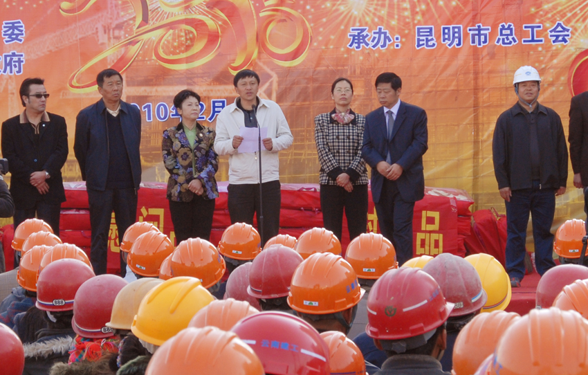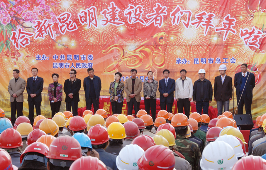 2月4日上午,受昆明市委、市政府委托,昆明市總工會(huì )主席楊麗等領(lǐng)導同志率團到云南建工第五建設有限公司昆明工人文化宮建設工地,給包括農民工在內的新昆明建設者拜年,給建設者送來(lái)新春的祝福和溫暖的禮品。楊麗主席和工會(huì )干部以及昆明市楓葉職工藝術(shù)團的演員們分別獻上精彩的歌舞。