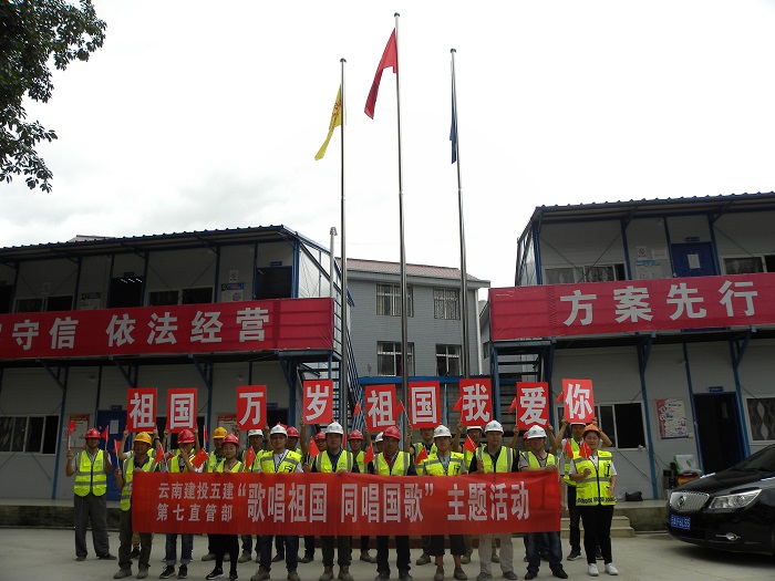 活動(dòng)先后在直管部、蘭坪縣營(yíng)盤(pán)鎮易遷項目、蘭福公路項目、嶍峨古鎮項目分別進(jìn)行。在項目部以開(kāi)展集中升國旗儀式,合唱、同唱國歌,快閃等方式,以《義勇軍進(jìn)行曲》《建投之歌》《我和我的祖國》為主唱曲目唱響愛(ài)國歌曲。