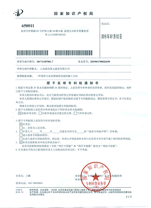 技術(shù)支持: 方森科技近日,公司《一種鋼管與水泥預制管連接的施工方法》與《一種鋼管與玻璃鋼夾砂管連接的施工方法》兩項技術(shù)成果榮獲國家發(fā)明專(zhuān)利授權。