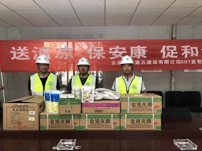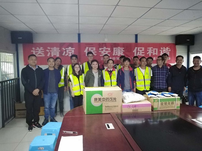 六月,畢鵬分別到2018年五華區C級不安全校舍重建項目、鎮雄縣第二人民醫院項目、大關(guān)縣翠華鎮中學(xué)項目進(jìn)行“送清涼”慰問(wèn),為項目一線(xiàn)職工們送去了菊花茶、十滴水、金銀花露、驅蚊藥水等物品。炎熱的夏季,頭頂烈日,穿梭于鋼筋叢林之中,一旦出現頭暈等中暑癥狀,一小瓶十滴水就會(huì )及時(shí)緩解癥狀;辛苦一天,晚上回到寢室,泡上一杯菊花茶,可緩解一天的疲勞;夜深了,點(diǎn)上一圈蚊香,或噴上一點(diǎn)驅蚊液,整夜好眠。