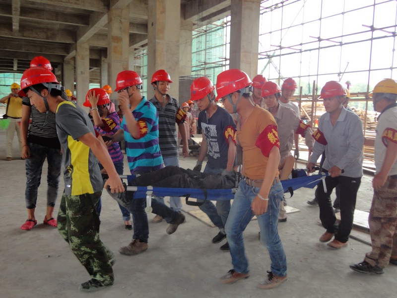 “事故”發(fā)生后,項目部安全員李福第一時(shí)間向項目部經(jīng)理董波匯報,董波立即向上級部門(mén)匯報情況,并撥打了120急救電話(huà),隨后立即指揮應急救援小組開(kāi)展救援?,F場(chǎng)保衛人員拉起警戒線(xiàn)維持現場(chǎng),搶救小組趕到事故現場(chǎng)拆除坍塌模板解救受傷人員,并對傷員傷口進(jìn)行簡(jiǎn)單的處理與包扎,等待救護車(chē)的到來(lái)……整個(gè)演練過(guò)程歷時(shí)二十多分鐘,大家有條不紊地參與了整個(gè)救援過(guò)程。
