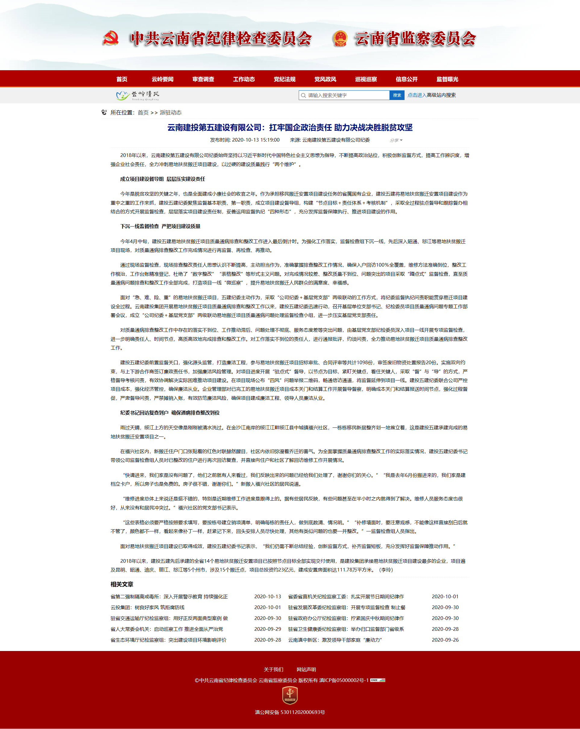 10月13日,中共云南省紀律檢查委員會(huì )、云南省監察委員會(huì )網(wǎng)站刊登公司文章《扛牢國企政治責任 助力決戰決勝脫貧攻堅》,對公司紀委自2018年以來(lái),始終堅持以習近平新時(shí)代中國特色社會(huì )主義思想為指導,不斷提高政治站位,積極創(chuàng )新監督方式,提高工作辨識度,增強企業(yè)社會(huì )責任,全力沖刺易地扶貧搬遷項目建設,以過(guò)硬的建設質(zhì)量踐行“兩個(gè)維護”表示肯定。 原文鏈接:http://w...