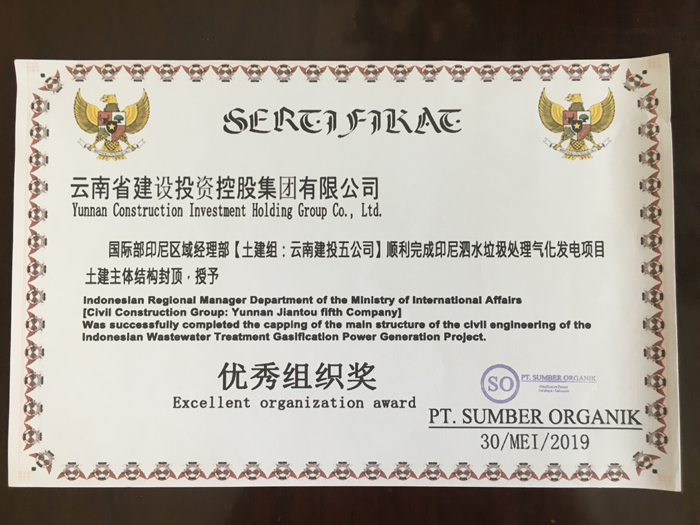 公司印尼泗水垃圾處理廠(chǎng)氣化發(fā)電項目獲優(yōu)秀組織獎