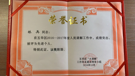 公司法務(wù)清欠部林兵榮獲五華區2016-2017年度人民調解工作先進(jìn)個(gè)人稱(chēng)號