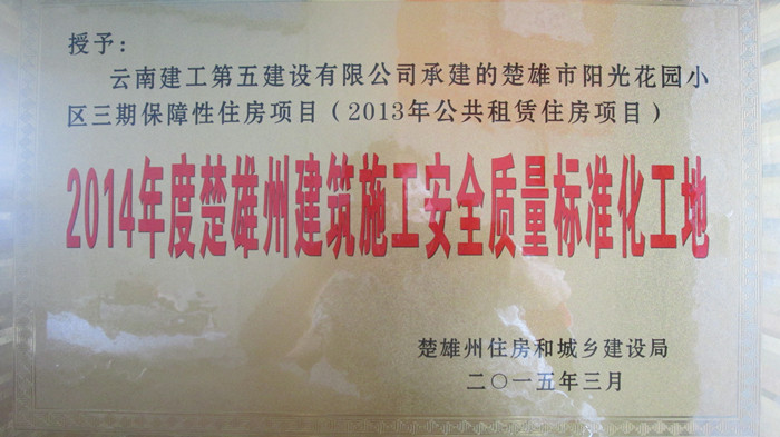 一分耕耘,一分收獲。近日,由五〇三直管項目部負責施工的楚雄市陽(yáng)光花園小區三期保障性住房項目榮獲“2014年度楚雄州建筑施工安全質(zhì)量標準化工地”榮譽(yù)稱(chēng)號。并于2015年3月24日正式授牌。 楚雄市陽(yáng)光花園小區三期保障性住房項目總建筑面積為61103.75平方米。包括7棟、8棟、9棟、10棟、11棟共五棟,地下一層,地上18層...