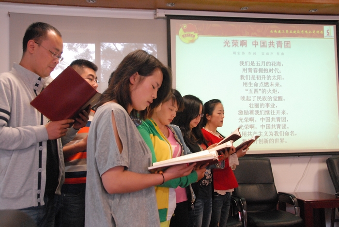 “我們是五月的花海,用青春擁抱時(shí)代;我們是初升的太陽(yáng),用生命點(diǎn)燃未來(lái)”,5月4日,五公司機關(guān)辦公樓會(huì )議室里回蕩著(zhù)嘹亮的歌聲,20余名團干部高唱團歌,迎接中國共產(chǎn)主義青年團成立92周年暨“五四”運動(dòng)95周年紀念日。 一曲團歌也唱響了青年心中的一腔熱血,隨后,參會(huì )的團干部代表向大家講述了五四青年節紀念的由來(lái)、分享了《習近平致青年:在實(shí)現中國夢(mèng)中書(shū)寫(xiě)精...