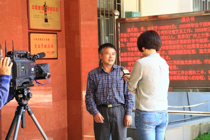 ??? 9月11日,云南日報、云南廣播電視臺(電視、電臺)、云南網(wǎng)、春城晚報、云南信息報、云南政協(xié)報、云南法制報、生活新報等多家媒體組成記者團,由省委宣傳部宣傳教育處帶隊到公司對施尤俊捐肝救母的感人事跡進(jìn)行相關(guān)采訪(fǎng)。 ??? 公司董事長(cháng)李文智,黨委書(shū)記李興奎,黨委副書(shū)記、紀委書(shū)記吳倩等領(lǐng)導及部分干部職工配合接受了媒體采訪(fǎng)。 ??? 8月20日,《云南日報》和《春城晚報》分別推出《80后小伙捐肝救母…
