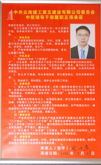 “尊敬的黨組織,職工同志們:作為云南建工第五建設有限公司一名中層領(lǐng)導干部,我將恪盡職守,履行職責。在此,我鄭重承諾:……”近日,公司中層以上領(lǐng)導干部均在各自辦公室醒目位置掛牌公示《中層領(lǐng)導干部履職五項承諾》。 早在今年5月初,為加強對中層干部的管理,強化監督,落實(shí)責任,促進(jìn)干部履職。公司紀檢監察部聯(lián)合黨委工作部制定《中層領(lǐng)...