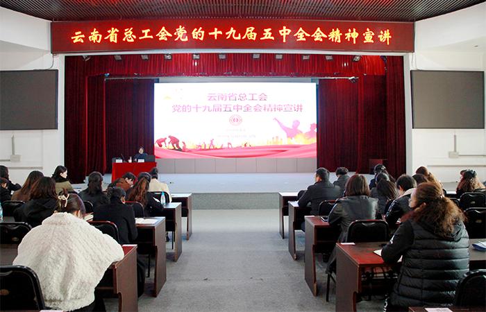 12月18日下午,云南省總工會(huì )在公司宣講黨的十九屆五中全會(huì )精神及習近平總書(shū)記在全國勞動(dòng)模范和先進(jìn)工作者表彰大會(huì )上的重要講話(huà)精神。集團工會(huì )副主席趙艷波主持宣講活動(dòng),公司工會(huì )主席冷蕊,機關(guān)各職能部門(mén)代表及各直管部、實(shí)體工會(huì )主席帶隊共96人參加宣講?;顒?dòng)邀請了云南省工青婦干部學(xué)校社會(huì )學(xué)副教授、黨政辦公室副主任劉瑞華老師為公司做黨的十九屆五中全會(huì )精神專(zhuān)題輔導和宣講,還邀請了全國勞模李永山、云南省勞模魏東作…