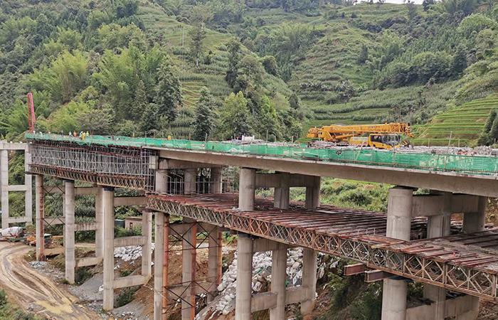 6月26日,在路橋五部負責施工的元綠高速七分部左幅阿德1號大橋施工現場(chǎng),五聯(lián)現澆箱梁順利澆筑完成,標志著(zhù)該項目橋梁主體工程進(jìn)入了良好的沖刺階段。?元綠高速澤初立交區包含主線(xiàn)橋梁5座,橋梁全長(cháng)左幅2034.66米、右幅2237.88米,設置匝道橋梁5座,橋梁全長(cháng)1291.12米。其中,主線(xiàn)阿德1號大橋位于元陽(yáng)至綠春高速公路澤初互通范圍內的主線(xiàn)橋梁,為雙幅橋梁,左幅全長(cháng)612.4米,起點(diǎn)樁號為ZK35…