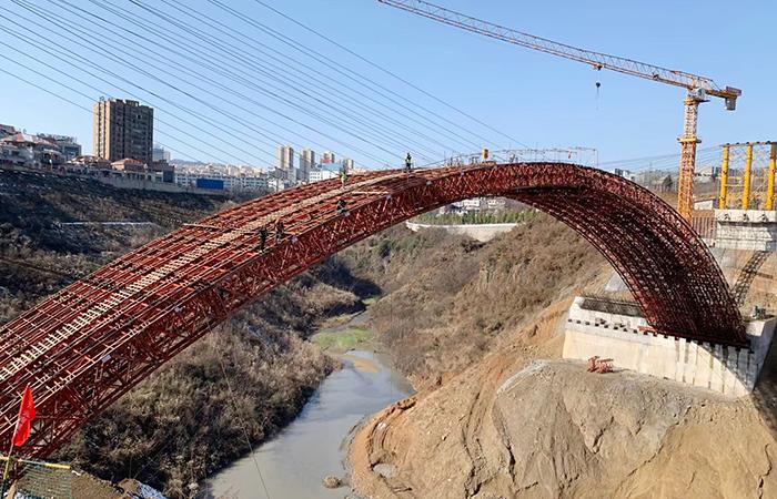 鎮雄三孔景觀(guān)橋鋼拱架順利合龍