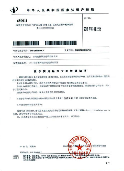 3月22日,第一安裝直管項目部在公司相關(guān)部門(mén)的指導下,榮獲國家實(shí)用新型專(zhuān)利《大口徑球墨鑄鐵管連續試壓裝置》。 在大理三庫連通項目的施工過(guò)程中,如何給1.2米的大口徑球墨鑄鐵管進(jìn)行試壓是第一安裝直管項目部面臨的一大考驗。在聽(tīng)取了多個(gè)設計單位、生產(chǎn)單位的建議后,揉合以往的相關(guān)經(jīng)驗,直管部研發(fā)出一套滿(mǎn)足試驗要求的“連續試壓裝置”。工程項目竣工之后,直管部積極總結施工經(jīng)驗,...