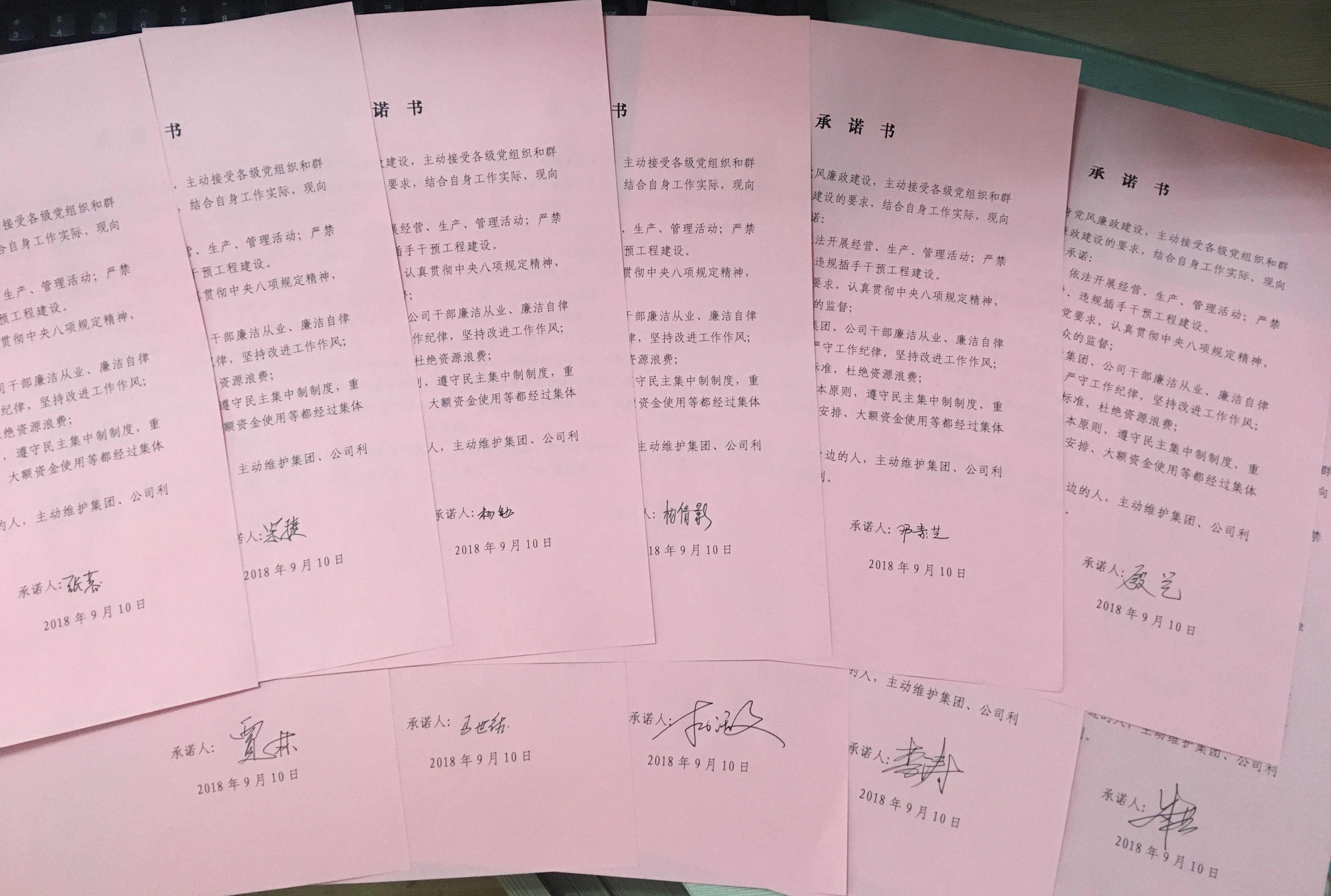 9月10日,五〇四直管部黨支部為進(jìn)一步強化黨風(fēng)廉政建設,增強領(lǐng)導干部、業(yè)務(wù)骨干的廉潔從業(yè)意識,,組織領(lǐng)導班子成員、項目經(jīng)理及科室負責人共計簽訂“承諾書(shū)”17份。直管部領(lǐng)導干部及業(yè)務(wù)骨干向黨組織和廣大職工群眾做出公開(kāi)承諾:帶頭遵紀守法,依法開(kāi)展經(jīng)營(yíng)、生產(chǎn)、管理活動(dòng),嚴格落實(shí)從嚴治黨要求,認真貫徹中央八項規定及其實(shí)施細則精神,堅持帶頭執行集團、公司干部廉潔從業(yè)、廉潔自律相關(guān)規定,堅持改進(jìn)工作作風(fēng),貫徹…