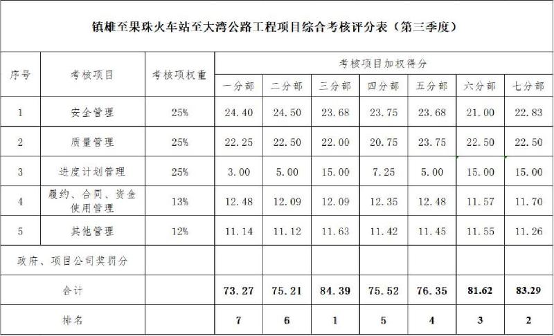 9月26日,在鎮雄縣鎮果公路建設開(kāi)發(fā)投資有限公司組織的鎮果公路項目的三季度檢查考核中,路橋四部承建的鎮果公路項目土建三分部以84.39的總分數在七個(gè)分部中取得了本季度綜合大檢查第一名的好成績(jì)。本次投資有限公司組織的三季度綜合大檢查以項目安全、質(zhì)量、進(jìn)度、環(huán)保、履約、合同及資金管理等建設目標的落實(shí)情況為主要考察內容。鎮果一級公路項目三分部不斷夯實(shí)日常管理工作中的各項細節工作,在檢查工作中各板塊均表現…